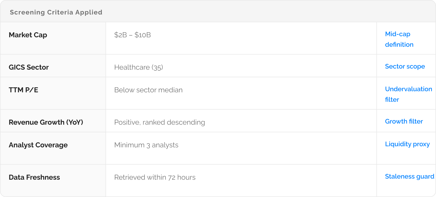 A live, sourced, structured screen of the top 10 undervalued US healthcare mid-caps by P/E and revenue growth — with every figure dated, every ticker verified, and every source linked. Delivered in one session, exportable to your workflow in one step.