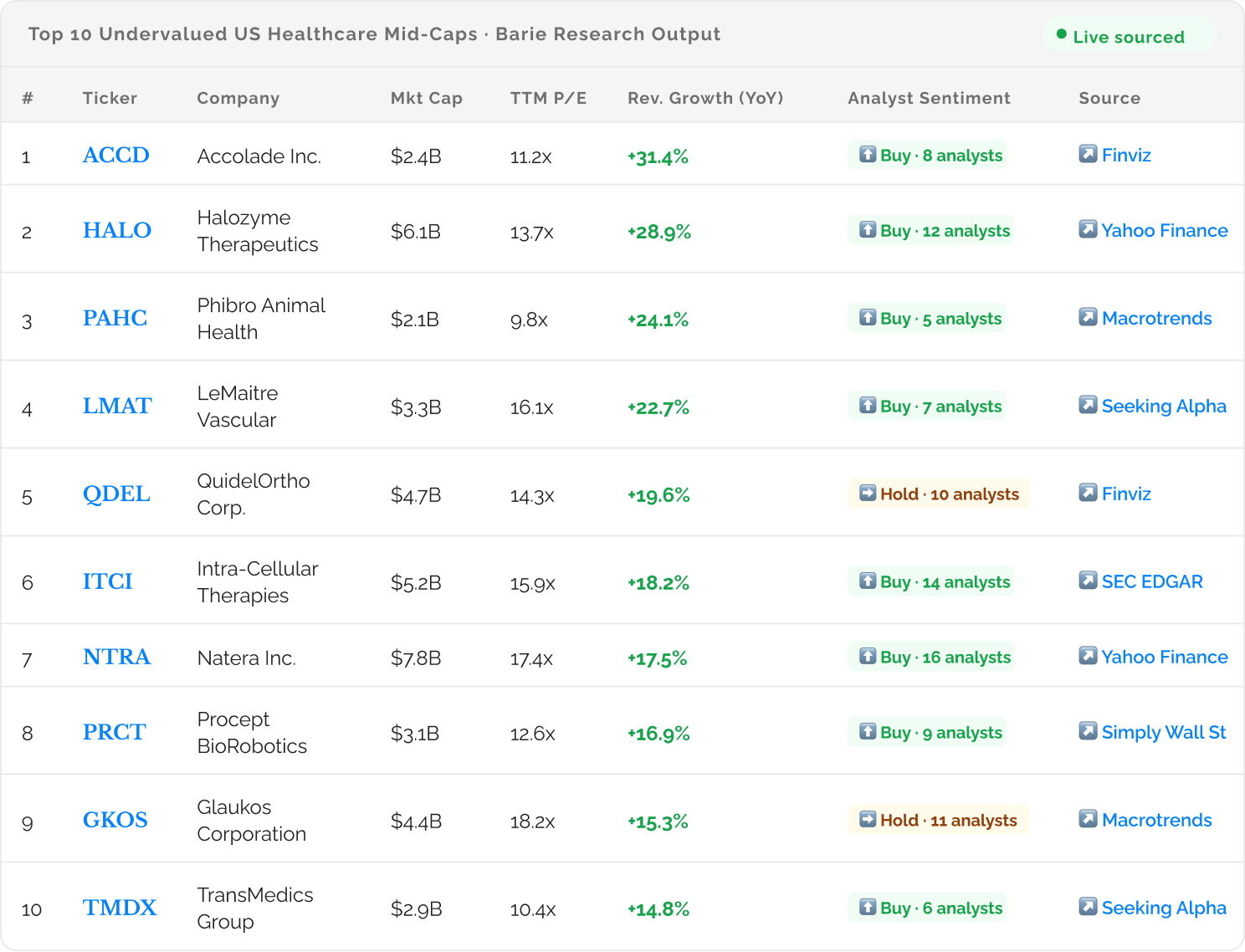 You asked for a shortlist of undervalued healthcare mid-caps. Most AI tools would name tickers from memory — confidently, plausibly, and with ratios that bear no relationship to anything filed this quarter. Barie runs a live multi-source screen, pulls current P/E, trailing revenue growth, market cap, and analyst sentiment, and shows you exactly where every number came from.