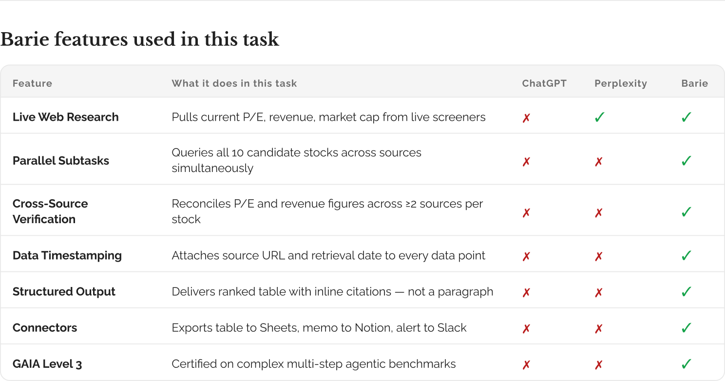 What it would take a research analyst a morning to compile manually — pulling screeners, cross-checking figures, verifying tickers, formatting a table — Barie does in one prompt. No fabricated ticker symbols. No invented ratios. No P/E figures from eighteen months ago presented as current.